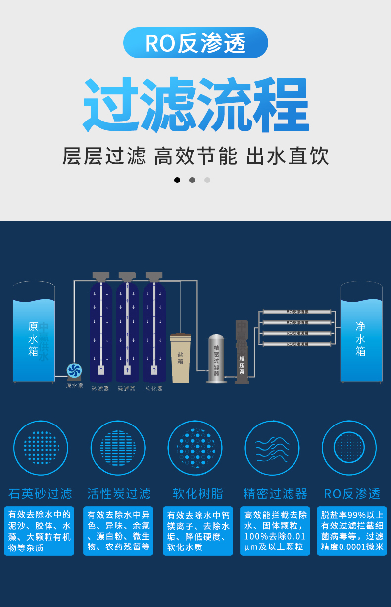 原水 → 原水箱 → 原水泵 →多介質(zhì)過(guò)濾器 (石英砂過(guò)濾器)→活性炭過(guò)濾器 →軟水處理器(添加阻垢劑裝置) → 精密過(guò)濾器 → 高壓泵 → 一級(jí)反滲透(RO)裝置 →紫外線殺菌裝置(臭氧殺菌裝置) → 用水點(diǎn)