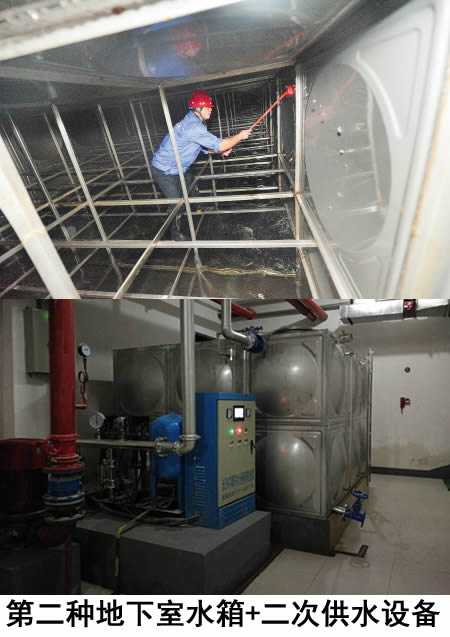 是通過地下室加壓泵將水送至樓頂的水箱,然后再自然流到用戶家中。這種供水方式,二次供水水箱一般都在樓頂;